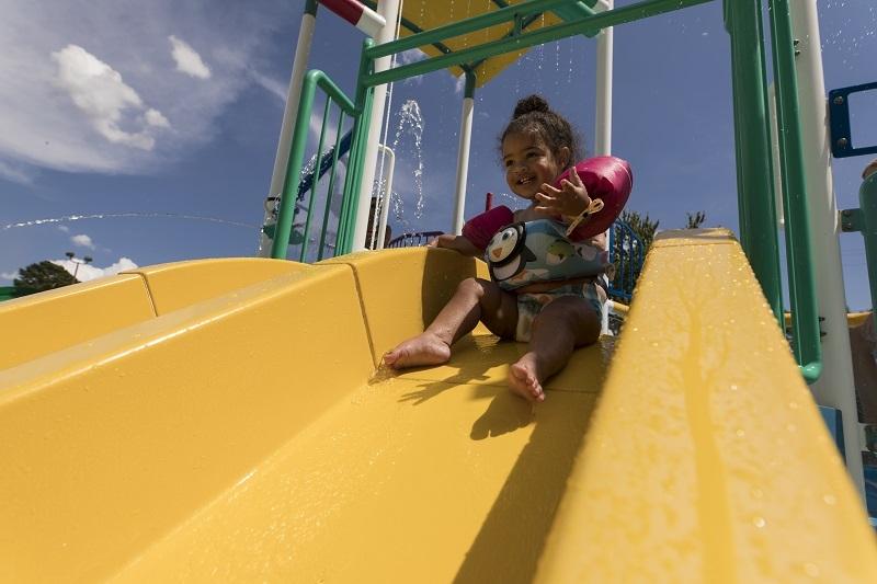 Splash Zone has a play pool that goes from zero to 2 1/2 feet with a play structure for children under 48 inches. The 25 yard pool, which goes from 4 to 11 feet, incorporates a diving board and a massage bench with Jacuzzi jets. We have a slide pool with a 24 foot and 26 foot slide for people who are 48 inches or taller.